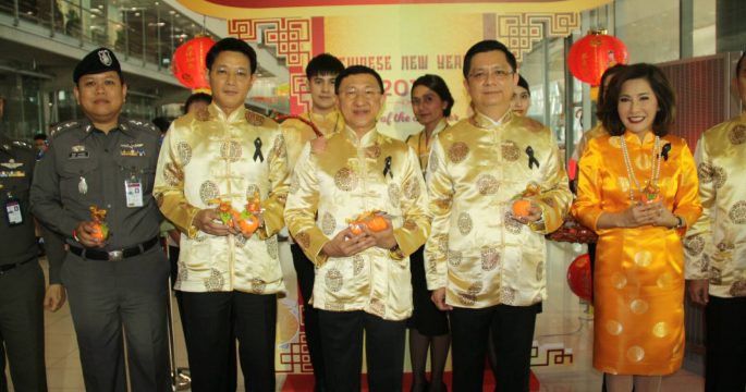 ท่าอากาศยานสุวรรณภูมินำเจ้าหน้าที่แต่งกายชุดจีนสร้างความประทับใจให้นักท่องเที่ยวเทศกาลตรุษจีน มอบของที่ระลึกสบู่ผลส้มและชมแสดงรำพัดจีน
