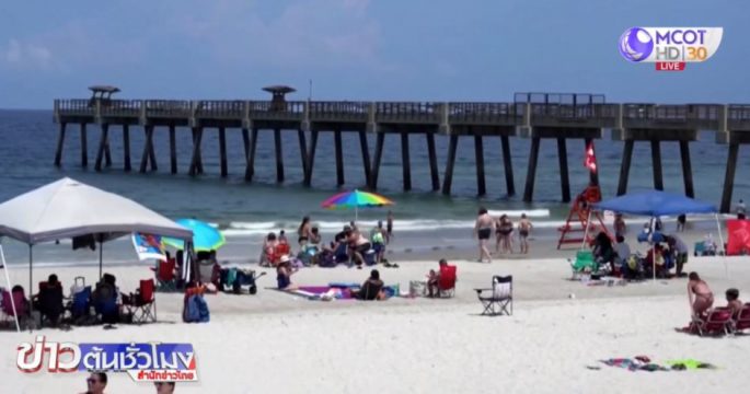 ชาวอเมริกันในรัฐฟลอริดาของสหรัฐพากันไปเที่ยวฉลองวันชาติ ที่ชายหาดเมืองแจ็คสันวิลล์ อย่างแน่นขนัด แม้ตัวเลขผู้ติดเชื้อโควิด-19 รายใหม่ในรัฐฟลอริดา จะยังเพิ่มวันละกว่า 10,000 คน อย่างต่อเนื่องถึง 3 วันแล้วก็ตาม