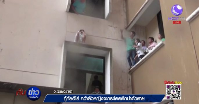 ภาพนาทีชีวิต เหล่าฮีโร่ช่วยหญิงสาวรายหนึ่งเกิดความเครียด ปีนออกนอกตึกโรงพยาบาลพุทธโสธร จะกระโดดตึกฆ่าตัวตาย แต่เจ้าหน้าที่หน่วยกู้ภัยฉะเชิงเทราอาศัยจังหวะคว้าตัวเอาไว้ได้
