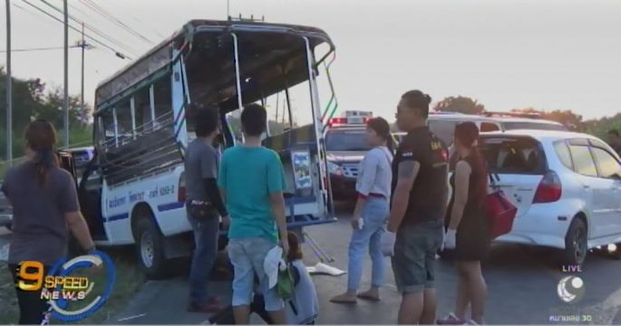 รถเก๋งพุ่งชนรถสองแถวรับจ้างประจำทาง บริเวณถนนเลียบคลองชลประทาน แยกจากถนนเส้นทางหลักฉะเชิงเทรา-บางน้ำเปรี้ยว มีผู้บาดเจ็บ 13 คน
