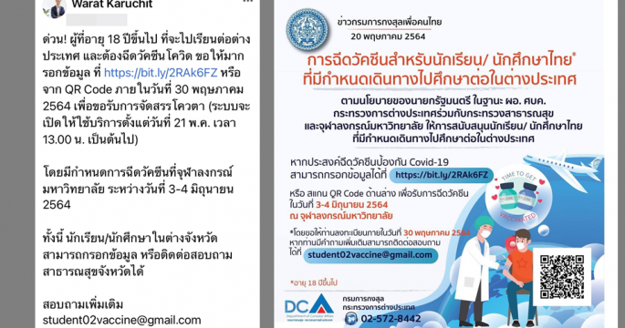 สำนักข่าวไทย 21 พ.ค.-ที่ปรึกษาด้านสื่อสาร ศบค.โพสต์แจ้งช่องทางลงทะเบียนสำหรับผู้มีอายุ 18 ปีขึ้นไป ต้องการไปเรียนต่อต่างประเทศ และจะต้องฉีดวัคซีน ผศ.ดร.วรัชญ์ ครุจิต รองคณบดีฝ่ายวางแผนและพัฒนา คณะนิเทศศาสตร์และนวัตกรรมการจัดการ สถาบันบัณฑิตพัฒนบริหารศาสตร์ (นิด้า) และที่ปรึกษาด้านการสื่อสาร ศูนย์บริหารสถานการณ์แพร่ระบาดของโรคติดเชื้อไวรัสโคโรนา 2019 (ศบค.) โพสต์เฟซบุ๊ก แจ้งข่าวด่วน ไปยังผู้มีอายุ 18 ปีขึ้นไป ที่จะไปเรียนต่อต่างประเทศและต้องฉีดวัคซีนโควิด ด่วน! ผู้ที่อายุ 18 ปีขึ้นไป ที่จะไปเรียนต่อต่างประเทศ และต้องฉีดวัคซีนโควิด ขอให้มากรอกข้อมูล ที่ https://bit.ly/2RAk6FZ หรือจาก QR Code ภายในวันที่ 30 พฤษภาคม 2564 เพื่อขอรับการจัดสรรโควตา (ระบบจะเปิดให้ใช้บริการตั้งแต่วันที่ 21 พ.ค. เวลา 13.00 น. เป็นต้นไป) โดยมีกำหนดการฉีดวัคซีนที่จุฬาลงกรณ์มหาวิทยาลัย ระหว่างวันที่ 3-4 มิถุนายน 2564 ทั้งนี้ นักเรียน/นักศึกษาในต่างจังหวัดสามารถกรอกข้อมูล […]