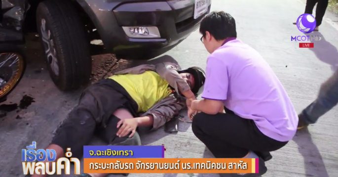 นักเรียนเทคนิคฉะเชิงเทรา ขี่รถจักรยานยนต์จะไปโรงเรียน แต่มีรถกระบะเลี้ยวกลับกลางถนน ทำให้พุ่งชนข้างรถเต็มแรง ร่างกระเด็นเข้าใต้รถกระบะเกือบโดนทับ อาการสาหัส
