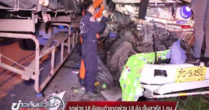 ใหญ่ชนใหญ่ รถเทรลเลอร์ 10 ล้อบรรทุกตู้คอนเทนเนอร์ ชนท้ายรถพ่วง 18 ล้อ ด้านหน้าพังยับ ผู้โดยสารที่นั่งมาด้วยกันเสียชีวิตคาที่