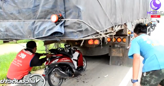 เจ้าหน้าที่ตรวจสอบเหตุรถจักรยานยนต์ไม่ติดแผ่นป้ายทะเบียน พุ่งชนมุดเสียบคาใต้ท้องรถสิบล้อ คนขี่เสียชีวิต ในจังหวัดชุมพร