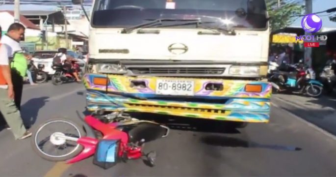 รถบรรทุก 10 ล้อ ชนท้ายรถจักรยานยนต์ บริเวณสามแยกรัษฎาฯ จ.ภูเก็ต หญิงอายุ 63 ปี คนขี่รถจักรยานยนต์เสียชีวิต ส่วนหลานสาววัย 11 ปี ที่นั่งซ้อนท้ายได้รับบาดเจ็บ