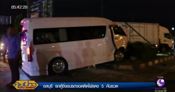หนุ่มวัย 20 ปี ซิ่งรถตู้ชนรถ 5 คันรวด ขณะจอดติดไฟแดงแยกนิคมสยามอีสเทริน์ บนถนนสาย 331 (สัตหีบ-ฉะเชิงเทรา) ขาเข้าสัตหีบ ต.บ่อวิน อ.ศรีราชา จ.ชลบุรี คนขับมีอาการคล้ายคนเมา และมีผู้บาดเจ็บหลายคน เจ้าหน้าที่กู้ภัยนำส่งโรงพยาบาลแหลมฉบัง