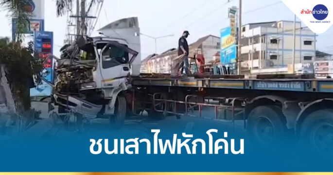 รถบรรทุก 18 ล้อ ฝ่าสายฝนตกหนัก ถนนลื่นรถเสียหลักชนอัดติดคาเสาไฟฟ้า รถพังยับ คนขับอาการสาหัส กู้ภัยฯ เร่งใช้อุปกรณ์ตัดถ่างเข้าช่วยเหลือ