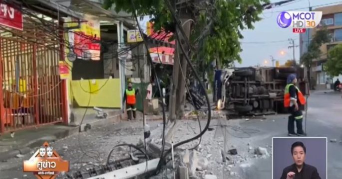 รถบรรทุก 6 ล้อเล็กส่งน้ำแข็งเสียหลักชนเสาไฟฟ้า ก่อนพลิกคว่ำบนถนนนวลจันทร์ ทำให้คนบนรถบาดเจ็บ 2 คน