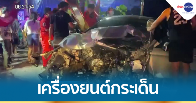 ชายวัย 40 ขับรถเก๋งหรูเสียหลักชนเสาไฟฟ้าหักสองต้นรถพังยับเยิน เครื่องยนต์หลุดกระเด็นข้ามถนนไปไกลกว่า 30 เมตร คนขับรอดหวุดหวิด