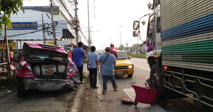 สมุทรสาคร 18 พ.ค.- เกิดอุบัติเหตุบนถนนเศรษฐกิจ-กระทุ่มแบน คนขับสิบล้อคอนเทนเนอร์หลับในชนรถแท็กซี่จอดรอผู้โดยสารริมถนนเสียหาย 4 คัน บาดเจ็บ 1 เมื่อเวลา 06.00 น. (18 พ.ค.) ร.ต.อ.ทิวัฒน์พล น้อยพิทักษ์ รองสารวัตร (สอบสวน) สภ.กระทุ่มแบน จ.สมุทรสาคร นำชุดเจ้าหน้าที่เข้าตรวจสอบอุบัติเหตุรถสิบล้อบรรทุกคอนเทนเนอร์ ทะเบียน 71- 6267 สงขลา เฉี่ยวชนรถแท็กซี่เสียหายถึง 4 คัน บนถนนเศรษฐกิจ 1 หมู่ 5 ต.ท่าไม้ มีผู้บาดเจ็บ 1 ราย คือ นายกิจตณศักดิ์ บุษบะ อายุ 56 ปี คนขับรถแท็กซี่ ทะเบียน ทศ 7617 กรุงเทพมหานคร ถูกนำส่งโรงพยาบาลวิชัยเวชฯ อ้อมน้อย ส่วนคนขับรถบรรทุกยืนรอให้การกับเจ้าหน้าที่ว่าขับรถบรรทุกคอนเทนเนอร์ห้องเย็นมาจากจังหวัดพัทลุง เพื่อมาบรรทุกสินค้าที่โรงงานย่านอ้อมน้อย เมื่อมาถึงที่เกิดเหตุเกิดวูบหลับและสะดุ้งรู้สึกตัวก็ไม่สามารถควบคุมรถได้ จึงพุ่งชนรถแท็กซี่ที่มาจอดเข้าคิวรอรับผู้โดยสารอยู่บริเวณดังกล่าว.-สำนักข่าวไทย