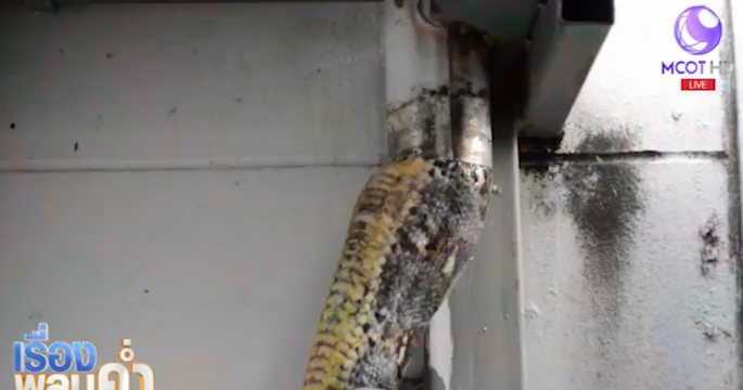 งูเหลือมติดอยู่ในรางน้ำของบ้านหลังหนึ่ง จ.ชลบุรี คาดฝนตกอากาศเย็น และมีความชื้น เจ้างูเหลือมคงเลื้อยออกมาจากป่าและหาที่อยู่ จนเลื้อยมาบนหลังคาบ้าน ก่อนที่จะเลื้อยลงท่อรางน้ำ แต่ด้วยมีขนาดใหญ่จึงทำให้ติดท่อ