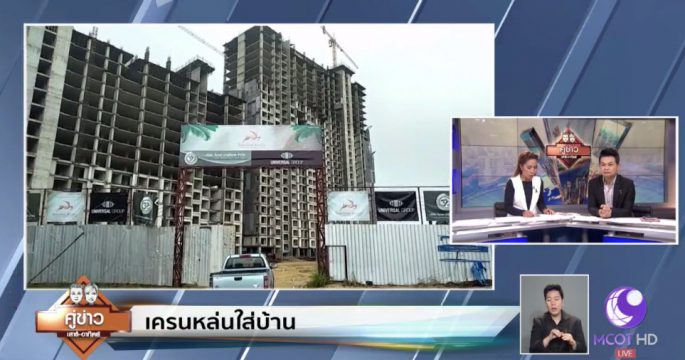 เจ้าหน้าที่ร่วมตรวจสอบเหตุเครนของโครงการก่อสร้างคอนโดหรู หล่นลงไปใส่บ้านประชาชนได้รับความเสียหาย ตั้งอยู่ภายในซอยวัดบุญกัญจนาราม ม.12 ต.หนองปรือ อ.บางละมุง จ.ชลบุรี