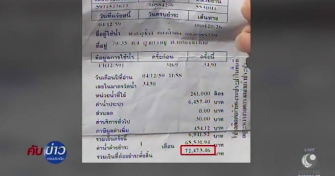 แม่ค้าขายน้ำเมืองชลแทบช็อก เจอบิลค่าน้ำ 72,000 บาท หลังจากนั้นไม่ถึงสิบวันก็เจอบิลค่าน้ำอีก 6,900 บาท ด้านการประปาส่วนภูมิภาค เผยพรุ่งนี้จะส่งทีมช่างตรวจสอบ