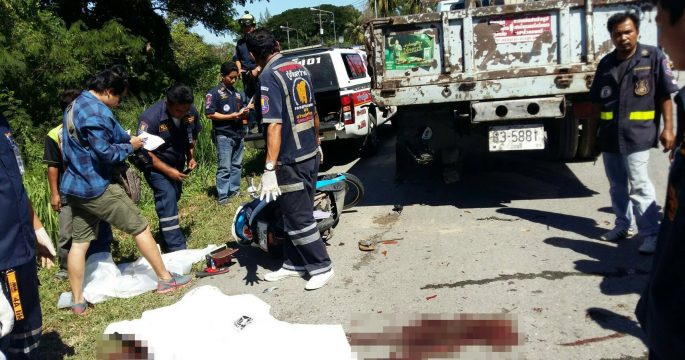 นักศึกษา กศน.ขี่ จยย.ซ้อนท้าย 5 คน พุ่งชนท้ายรถหกล้อที่จอดรอเลี้ยวเข้าซอย ตาย 3 บาดเจ็บ 2