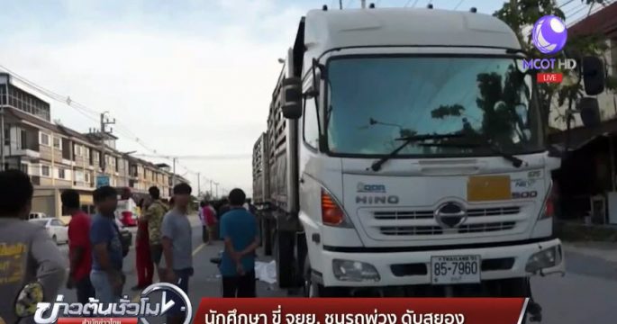 นักศึกษา ปวช.ปี 3 ขี่รถจักรยานยนต์เฉี่ยวชนกับรถบรรทุกพ่วง 22 ล้อ บนถนนพานทอง-บ้านบึง จ.ชลบุรี ถูกล้อทับร่างเสียชีวิต