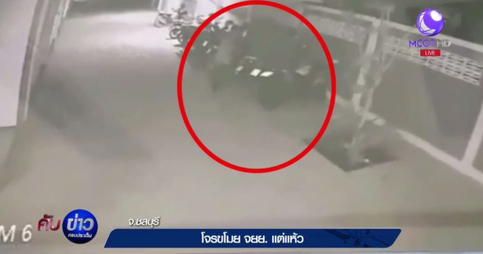 กล้องวงจรปิดบันทึกภาพคนร้ายกำลังงัดแงะรูกุญแจเพื่อจะขโมยรถจักรยายยนต์ที่จอดในลานจอดรถ ใช้เวลาอยู่ 5 นาที แต่ไม่สามารถเอารถไปได้