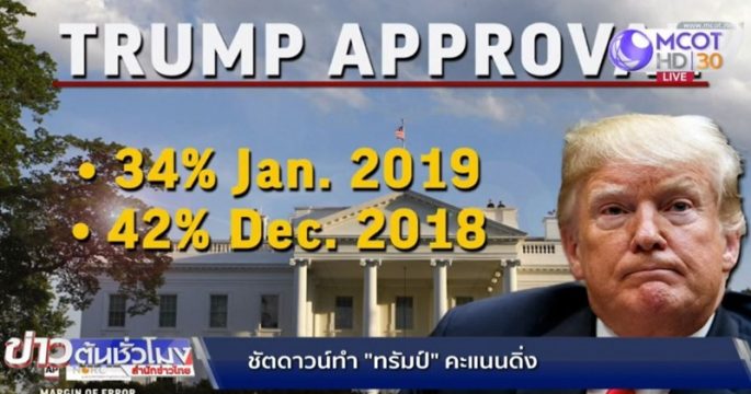 สถานการณ์ชัตดาวน์ที่ยาวนานเป็นประวัติการณ์ ส่งผลให้คะแนนนิยมในตัวประธานาธิบดีโดนัลด์ ทรัมป์ ดิ่งลงจนเกือบต่ำสุดในรอบกว่า 1 ปี