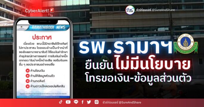 ชัวร์ก่อนแชร์ CyberAlert!🚨: อย่าหลงเชื่อ ! รพ.รามา ยืนยันไม่มีนโยบายโทรขอเงิน-ข้อมูลส่วนตัว