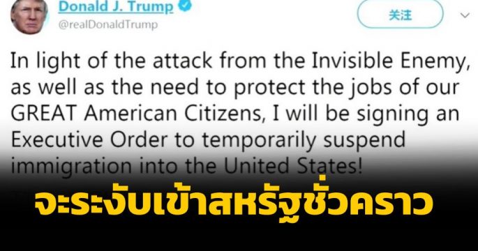 ประธานาธิบดีโดนัลด์ ทรัมป์ ผู้นำสหรัฐ ทวีตข้อความว่า จะระงับการเดินทางเข้าสหรัฐเป็นการชั่วคราว เนื่องจากการแพร่ระบาดของโรคติดเชื้อไวรัสโคโรนา 2019