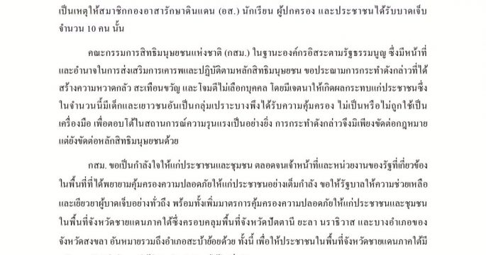 กรรมการสิทธิมนุษยชนออกแถลงการณ์ ประณามการลอบวางระเบิดที่สะบ้าย้อย เป็นเหตุให้ชาวบ้าน เด็ก และเยาวชนได้รับบาดเจ็บ