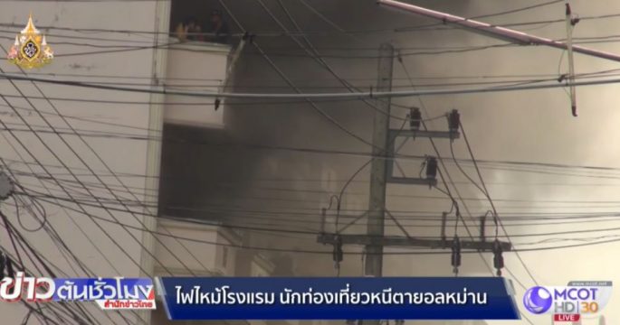 เกิดเหตุไฟไหม้โรงแรมขนาด 6 ชั้น บริเวณแนวพรมแดนไทย-มาเลเซีย อ.สะเดา จ.สงขลา นักท่องเที่ยวต้องปีนระเบียงหนีตายลงมา หลายคนสำลักควัน เจ้าหน้าที่นำตัวส่งโรงพยาบาล ใช้เวลาประมาณครึ่งชั่วโมงก็ควบคุมเพลิงได้ แต่ยังมีกลุ่มควันหนาแน่น