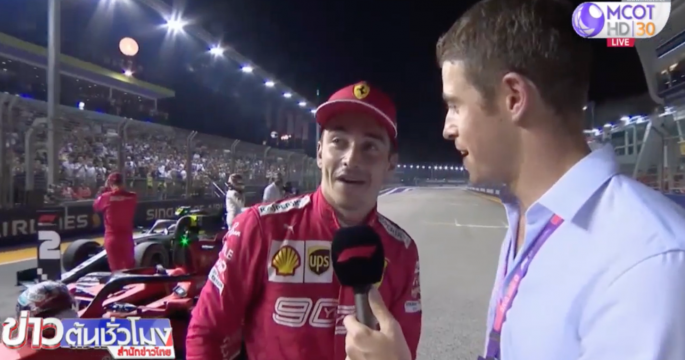 ชาร์ลส เลอแคลร์ นักขับหนุ่มโมนาโก สังกัดเฟอร์รารี ทำเวลาต่อรอบเร็วที่สุด 1 นาที 36.217 วินาที คว้าตำแหน่งโพโพลซิชั่น “สิงคโปร์ กรังด์ ปรีซ์ 2019”