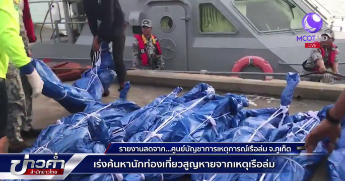 จนท.ระดมทีมค้นหานักท่องเที่ยวที่ส่วนใหญ่เป็นชาวจีนที่สูญหายจากเรือล่มกลางทะเลภูเก็ต ล่าสุดเมื่อเวลา 19.00 น.ที่ผ่านมา พบยอดผู้เสียชีวิตเพิ่มเป็น 33 ราย และสูญหายอีก 23 ราย