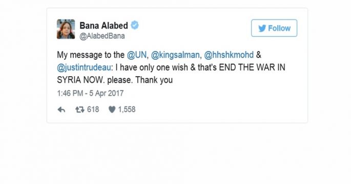 เว็บไซต์ซีเอ็นเอ็นเผยแพร่ทวิตเตอร์ของเด็กหญิงชาวซีเรียวัย 7-8 ปีแสดงความเห็นต่อเหตุการณ์ใช้อาวุธเคมีถล่มเมืองในจังหวัดอิดลิบเมื่อวันอังคาร