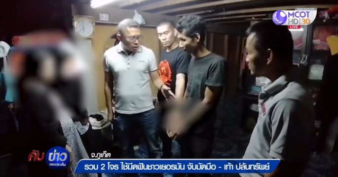 ตำรวจภูเก็ตคุมตัว 2 ผู้ต้องหาลงมือก่อเหตุใช้มีดฟันแขนชาวเยอรมันภายในบ้านพัก ก่อนปล้นทรัพย์หลบหนีได้แล้ววันนี้ หลังผู้ต้องหาหนีไปกบดานอยู่ที่สตูล