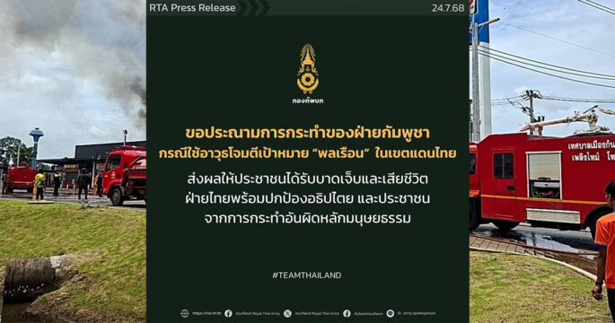 24 ก.ค.- “กองทัพบก” อัปเดตเหตุปะทะชายแดนไทย-กัมพูชา ประชาชนเสียชีวิต 9 ราย เป็นเด็ก 1 ราย เจ็บ 14 ราย พร้อมประณามกัมพูชา ใช้อาวุธโจมตีเป้าหมายพลเรือนในเขตแดนไทย ที่กองบัญชาการกองทัพบก พ.อ.ริชฌา สุขสุวานนท์ รองโฆษกกองทัพบก เปิดเผยว่าจากสถานการณ์การปะทะพื้นที่ชายแดนไทย–กัมพูชา อันสืบเนื่องมาจากฝ่ายกัมพูชาเปิดฉากยิงเข้าใส่ฐานทหารไทยที่ปราสาทตาเมือนธม จ.สุรินทร์ ตั้งแต่เมื่อเช้าวันนี้ (24 ก.ค. 68) ปัจจุบันกองทัพบกได้รับรายงานเบื้องต้นจากส่วนราชการในพื้นที่ว่า มีพื้นที่พลเรือนตกเป็นเป้าหมายของอาวุธยิงสนับสนุนของฝ่ายกัมพูชา จนทำให้บ้านเรือนประชาชนได้รับความเสียหาย รวมถึงมีประชาชนได้รับบาดเจ็บและเสียชีวิต ดังนี้ ทั้งนี้ กองทัพบกขอประณามการกระทำอันรุนแรงต่อเป้าหมายพลเรือนของฝ่ายกัมพูชา และพร้อมดำเนินการทางทหารเพื่อปกป้องอธิปไตยและประชาชนจากการกระทำอันผิดหลักมนุษยธรรมดังกล่าวอย่างถึงที่สุด -สำนักข่าวไทย