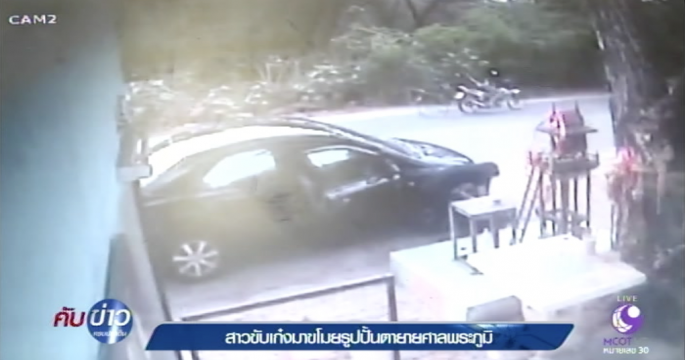 กล้องวงจรปิดจับภาพสาวขับเก๋งขโมยรูปปั้นตายายศาลพระภูมิ ชาวบ้านคาดจุดประสงค์ของผู้ก่อเหตุมาจากเรื่องของความเชื่อ