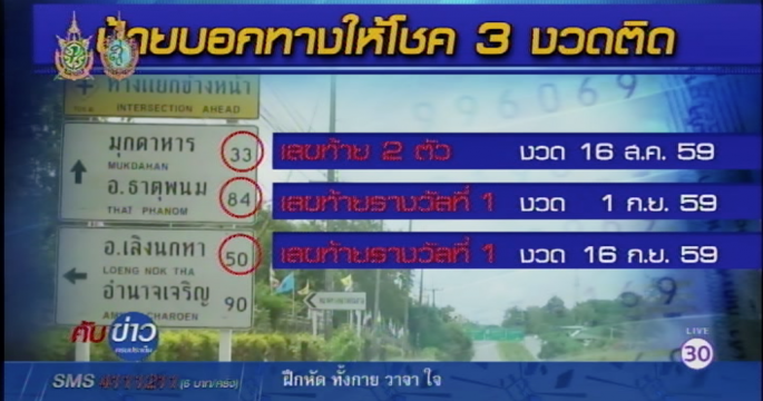 ชาวบ้านยังแห่ตามไปพิสูจน์ ป้ายบอกทางให้โชค บริเวณริมถนน อ.ดอนตาล จ.มุกดาหาร หลังสอดคล้องกับรางวัลสลากฯ เลขท้าย 2 ตัว 3 งวดติด