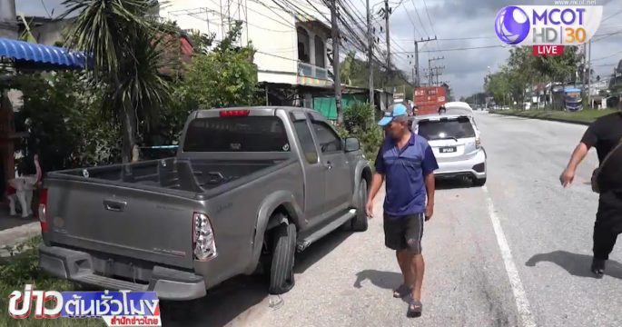 เก๋งนักท่องเที่ยวชาวมาเลเซียยางล้อหน้าแตก เสียหลักพุ่งชนท้ายกระบะจอดริมถนน ใน อ.หาดใหญ่ โชคดีไม่มีอุบัติเหตุซ้ำซ้อน