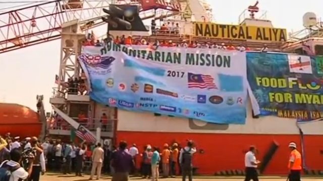 เรือมาเลเซียซึ่งลำเลียงสิ่งของบรรเทาทุกข์ชาวมุสลิมโรฮิงญาหลายพันคนที่อพยพหนีการปราบปรามนองเลือดในเมียนมาร์ มาเทียบท่าที่เมืองจิตตะกอง