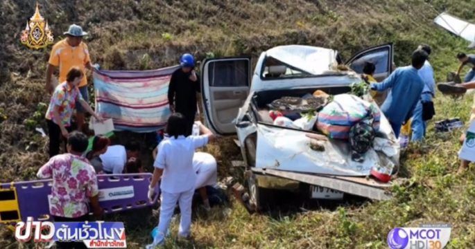 กระบะขนคนงานชาวลาวพุ่งตกข้างทางบนถนนมะลิวรรณ ขาเข้า อ.เมืองเลย ก่อนพลิกคว่ำอย่างรุนแรงจนฝุ่นตลบ คนงานชาวลาวเสียชีวิต 1 คน บาดเจ็บสาหัส 5 คน