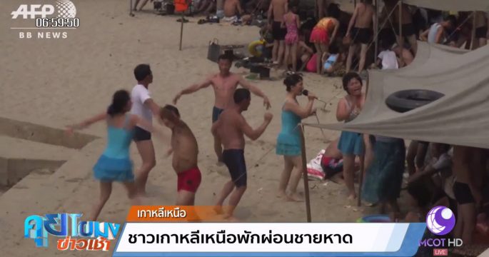 ภาพที่ไม่ค่อยได้เห็นบ่อยนัก กับบรรยากาศการพักผ่อนหย่อนใจของชาวเกาหลีเหนือที่ชายหาดแห่งหนึ่งทางตะวันตกของกรุงเปียงยาง ที่ผู้คนต่างมาเล่นน้ำทะเล ร้องเพลงเต้นรำ และย่างหอยบนหาด