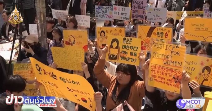 ชาวเกาหลีใต้ชุมนุมใกล้สถานทูตญี่ปุ่น ในกรุงโซล เพื่อเรียกร้องให้ญี่ปุ่นกล่าวคำขอโทษต่อเกาหลีใต้อย่างเป็นทางการ กรณีกองทัพญี่ปุ่นเคยรุกรานและบีบบังคับให้สตรีชาวเกาหลีใต้ต้องเป็นทาสบำเรอกามของทหารญี่ปุ่นสมัยสงครามโลกครั้งที่ 2