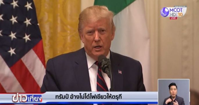 ประธานาธิบดีโดนัลด์ ทรัมป์ ของสหรัฐ อ้างว่า เขาไม่ได้ให้ไฟเขียวแก่ตุรกีโจมตีกองกำลังชาวเคิร์ดทางเหนือของซีเรีย และย้ำว่าทหารสหรัฐไม่ได้ตกอยู่ในอันตรายจากการโจมตีของทหารตุรกี