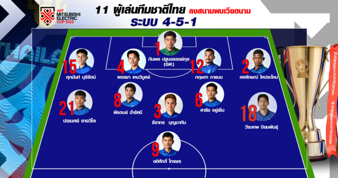 “อดิศักดิ์ ไกรษร” ออกสตาร์ทตัวจริงแทน “ธีรศิลป์ แดงดา” ในฟุตบอลชิงแชมป์อาเซียน 2022 รอบชิงชนะเลิศ นัดแรก ทีมชาติไทย บุกเยือนเวียดนาม เวลา 19.30 น. ช่อง 9 MCOT HD หมายเลข 30 ถ่ายทอดสด