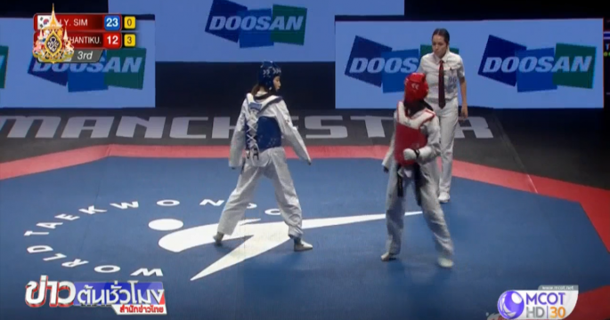 ผลการแข่งขันเทควันโดชิงแชมป์โลก รอบชิงชนะเลิศ ณ ประเทศอังกฤษ ในรุ่น 53 กก.หญิง น้องนก พรรณนภา ชนะ ทาตินนา คูดาโชว่า จากรัสเซีย 20 ต่อ 10 คะแนน