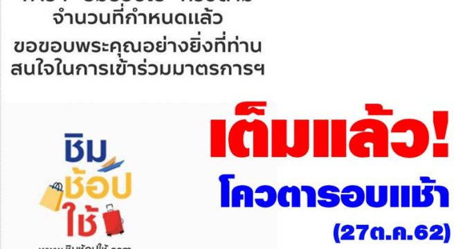 ชิมช้อปใช้เฟส 2 รอบเก็บตก วันที่ 4 เช้านี้ (27 ต.ค.) ครบจำนวน 91,987 คนแล้ว เมื่อเวลา 06.25 น. ลงทะเบียนได้อีกครั้งเวลา 18.00 น.