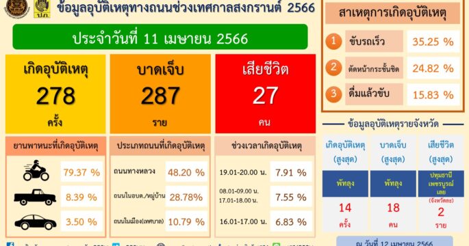 ศปถ.สรุปตัวเลขวันแรกการรณรงค์ “ชีวิตวิถีใหม่ ขับขี่อย่างปลอดภัย ไร้อุบัติเหตุ” เทศกาลสงกรานต์2566 เกิดอุบัติเหตุ 278 ครั้ง บาดเจ็บ 287 คน ผู้เสียชีวิต 27 ราย เหตุขับรถเร็ว