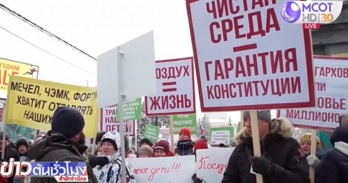 ชาวเมืองเชลยาบินสก์ใกล้เทือกเขายูรัลในรัสเซีย ฝ่าอากาศที่หนาวเย็นจัดร่วมชุมนุมประท้วงเรียกร้องให้ทางการแก้ปัญหามลพิษในอากาศหลังเกิดหมอกควันปกคลุมทั่วเมืองนานถึง 2 สัปดาห์