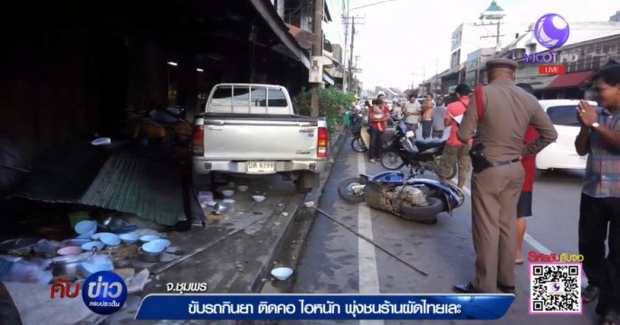 ชายวัย 60 ขับรถกินยา เกิดติดคอ ไอหนัก เหยียบคันเร่งพุ่งชนร้านผัดไทยโบราณ ในตลาดหลังสวน จ.ชุมพร พังยับเยิน แม่ค้าขายผัดไทยบาดเจ็บสาหัส