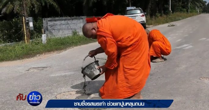 พระและสามเณร ช่วยกันซ่อมแซมหลุมบนถนนหลังสถานีรถไฟนาชะอัง ต.นาชะอัง อ.เมือง จ.ชุมพร ช่วยเหลือชาวบ้าน