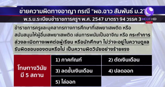 สำนักข่าวไทย ตรวจสอบข้อมูลการเอาผิดวินัยร้ายแรง กรณีที่ ผอ.โรงเรียน มีสัมพันธ์ลึกซึ้งกับนักเรียน นอกเหนือความผิดทางวินัยร้ายแรงแล้ว ยังมีความผิดทางอาญา เนื่องจากเด็กสาวอายุไม่ถึง 15 ปี
