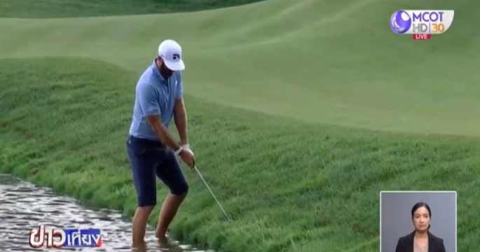 ดัสติน จอห์นสัน โปรเจ้าสหรัฐ ต้องถลกขากางเกงก่อนที่จะลงไปในทะเลสาบ เพื่อจะชิปลูกขึ้นจากน้ำ เพื่อทำเบอร์ดี้ หลุมที่ 15 ในศึก “พีจีเอ ทัวร์” รายการ “ทราเวลเลอร์ แชมเปียนชิพ” ที่สหรัฐอเมริกา