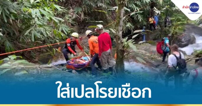 ทรหด ใส่เปลโรยเชือกช่วยนักท่องเที่ยวบาดเจ็บลงจากน้ำตก
