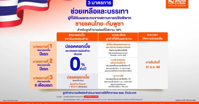 กรุงเทพฯ 4 ส.ค. – ธอส.ออกมาตรการพักชำระหนี้นานสูงสุด 1 ปี ช่วยเหลือลูกค้าชายแดนไทย – กัมพูชา สนใจติดต่อได้ทุกสาขา ตั้งแต่วันนี้ถึง 31 ธันวาคม 68 นายกมลภพ วีระพละ กรรมการผู้จัดการธนาคารอาคารสงเคราะห์ (ธอส.) เปิดเผยว่า ธอส. มีความห่วงใยพี่น้องประชาชนที่อยู่ในพื้นที่ชายแดนไทย – กัมพูชา ให้ความช่วยเหลือเพิ่มเติมครอบคลุมลูกค้ารายย่อยที่มีสถานะ NPL กับ “มาตรการช่วยเหลือและบรรเทาผู้ที่ได้รับผลกระทบจากสถานการณ์พิพาทชายแดนไทย – กัมพูชา” จำนวน 3 มาตรการ ประกอบด้วย มาตรการที่ 1 สำหรับลูกค้าที่เสียชีวิตหรือทุพพลภาพถาวร หรือหลักประกันได้รับความเสียหายทั้งหลัง จนไม่สามารถพักอาศัยได้ โดยเดือนที่ 1-12 ได้รับอัตราดอกเบี้ย 0% พร้อมปลอดการผ่อนชำระเงินงวด จากนั้นให้ผ่อนชำระอัตราดอกเบี้ย 0.01% ตลอดระยะเวลาคงเหลือ มาตรการที่ 2 สำหรับลูกค้าที่บาดเจ็บสาหัส หรือหลักประกันได้รับความเสียหาย สามารถประนอมหนี้ระยะเวลา ไม่เกิน 5 ปี […]