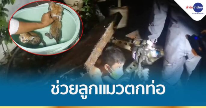 ลูกแมววัยเดือนเศษ 2 ตัว ติดในช่องว่างข้างผนังของร้านคาร์แคร์ เจ้าหน้าที่กู้ภัยทุบผนังร้าน ช่วยออกมาได้